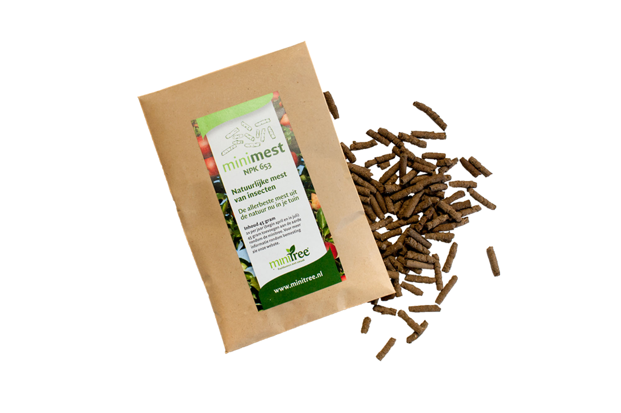 MiniMest is organische insectenmest. De geperste korrels mest zijn afkomstig van de uitwerpselen van insecten. Doordat insecten alleen organisch materiaal eten, zijn de uitwerpselen 100% voor bomen of planten beschikbaar. MiniMest is een ecologisch en skal gecertificeerd product. Na betaling ontvang je automatisch in April 2025 en Juli 2025 de mest in je brievenbus.